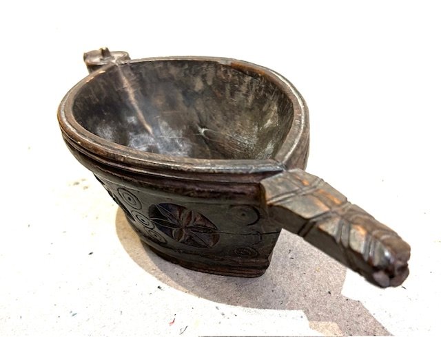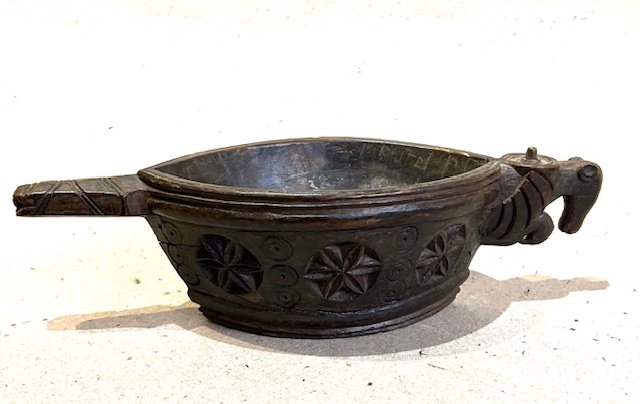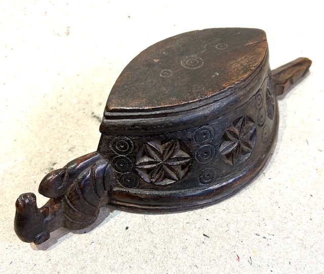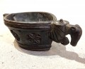 Flot skåret træskål med motiv af vædder og påfugl ved drikketud, hvorfra man drak opium blandet med vand mælk....