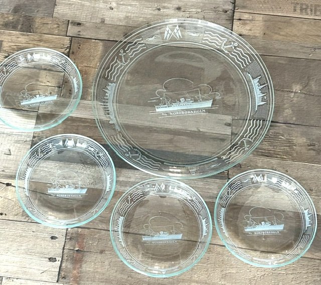 Lagkagefad og 4 sidetallerkner med motiv af færgen Nordbornholm.