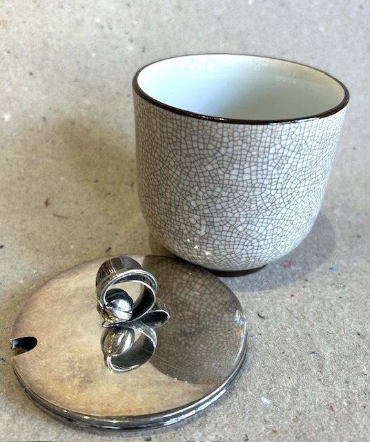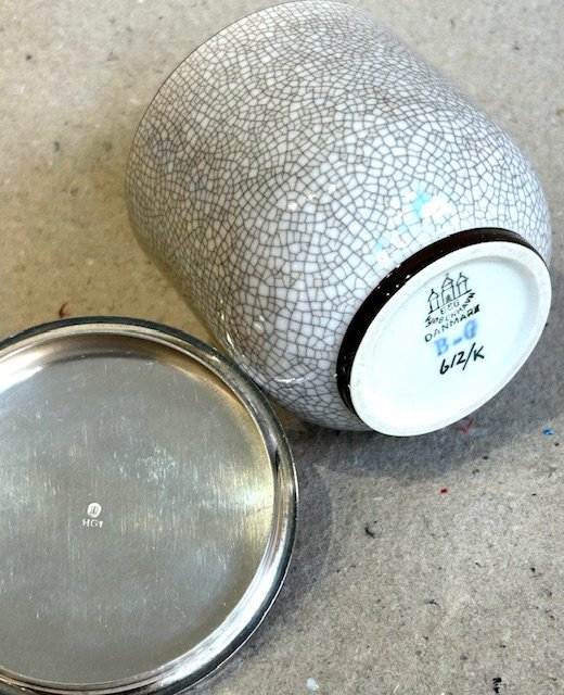B&G krakkele krukke med sølvlåg.