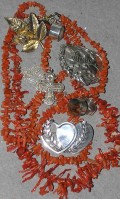 Gamle Tyrkiskæder, Koral kæder i kugler, gamle ravsmykker i sølv mm.