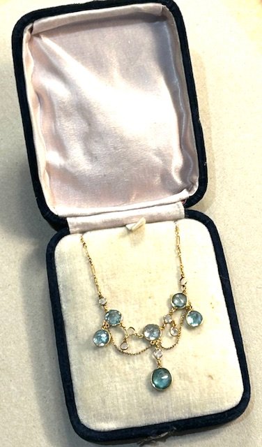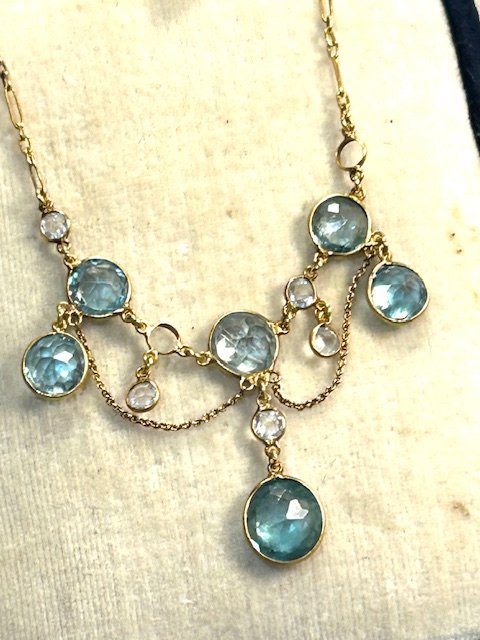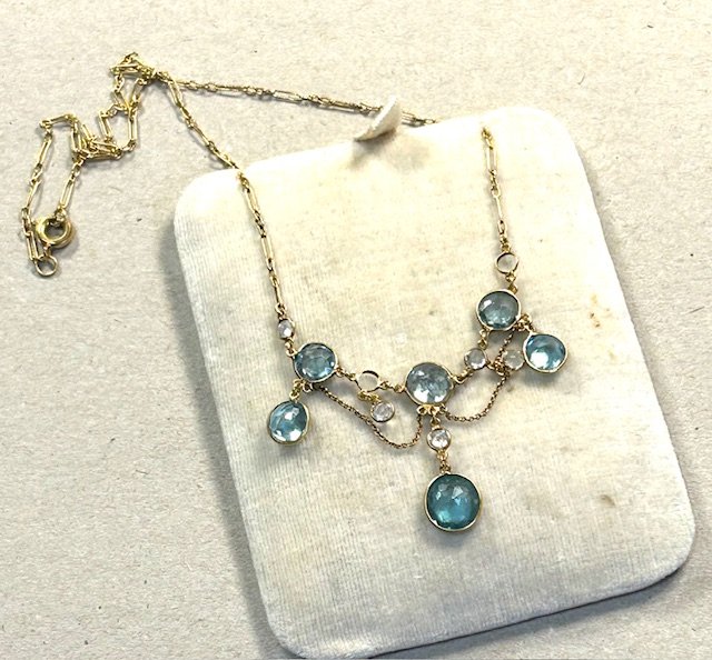 Guld kæde med 6 blå og 6 hvide stene, fra først 1900.