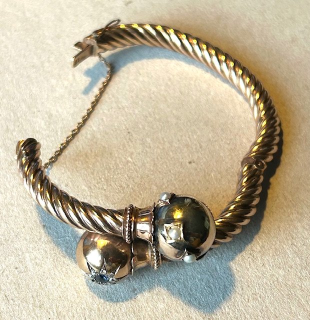 Antik snoet guld armring med safir, gammelslebne diamanter og flodperler.