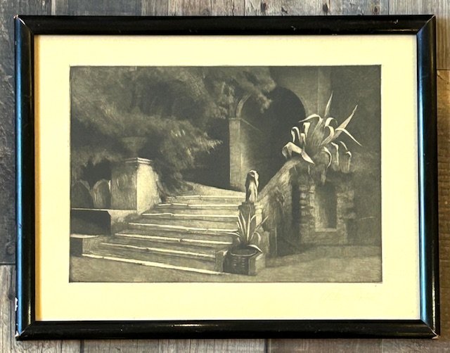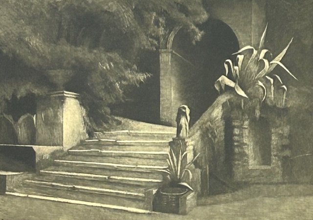 Peter Ilsted Mezzotinte sort hvid trappeparti. Blyants signeret.