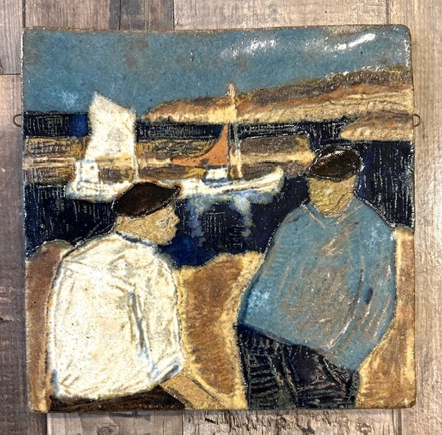 Nis Staugaard stentøjs relief med motiv af 2 fiskere.