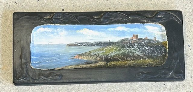 Relief i Art nouveau relief med måger og tang, malet motiv af Hammershus.