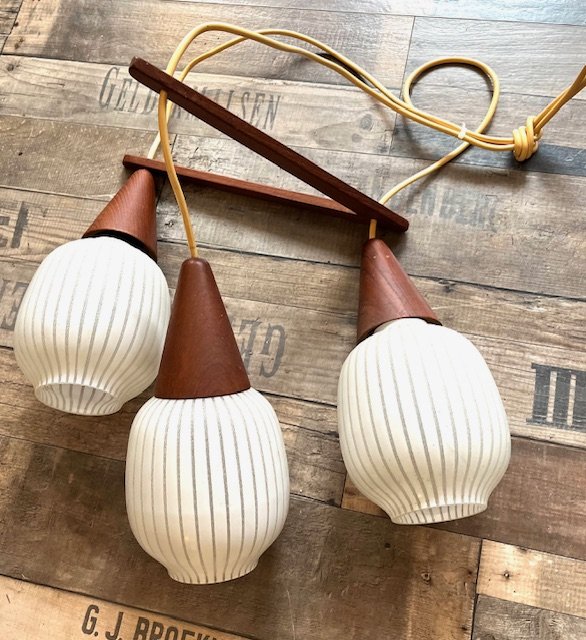 Teak loftlampe med 3 pendler, teaktræ med hvidstribede glasskærme.