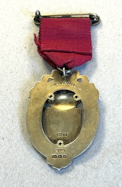 England. Frimurer vedhæng Steward, fra Royal Masonic Benevolent inst. 1934, med originalt bånd. Forgyldt sterlinsølv med flot emalje arbejde.