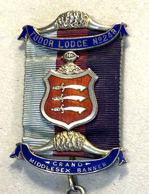 England. Frimurer vedhæng fra Tudor Lodge nr 248, Bøffelorden Grand Middelsex Banner.Delvis forgyldt sterlingsølv med emalje arbejde og originalt bånd.